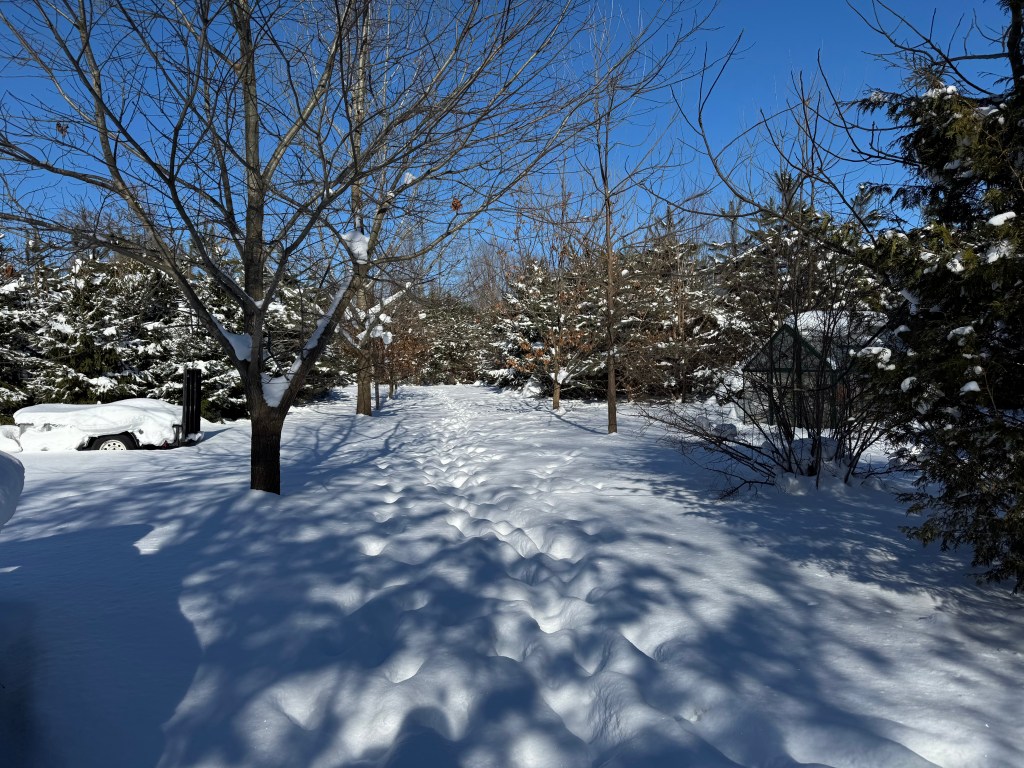 A platoon may have marched this path, or just a few deer finding their way through the drifts and trees. Bluecircle neighbor Chris keeps corn and birdseed feeders that promote a regular pilgrimage by the wood goats. The half-buried trailer on the left shows nearly 3 weeks of lake-effect snowfall, making skis or snowshoes necessary unless you have fur. Or longer, younger legs than this author.