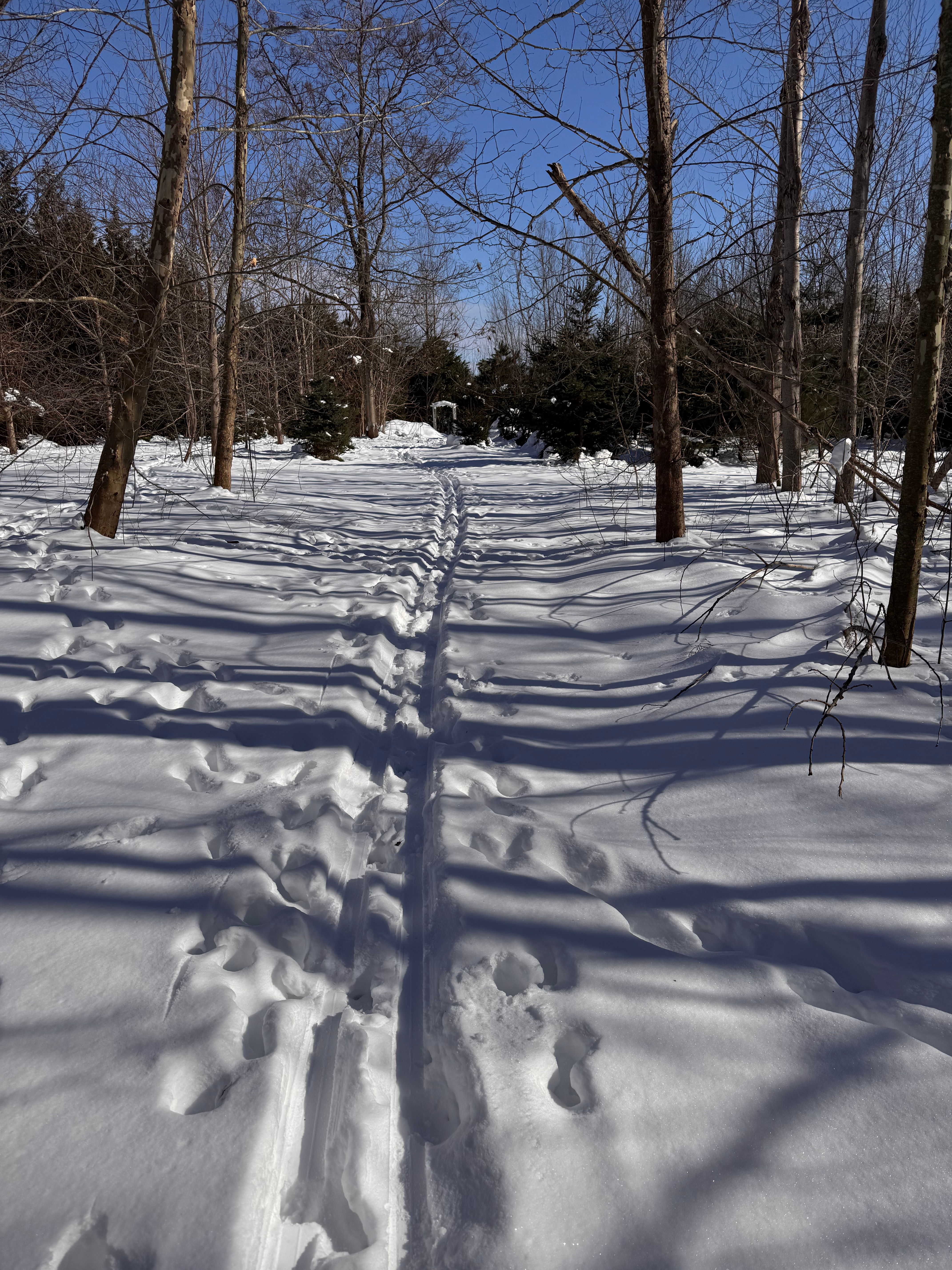 The sustained cold has made cross-country trails in these woods better than usual. Deer often follow them, compacting the snow but not reducing their utility – unless “nature calls” and the yellow snow melts to the ground (not pictured!).