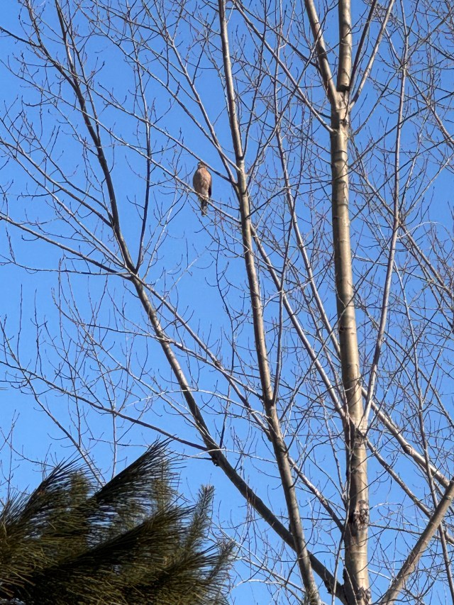 Last week a red fox carried off one of the many black squirrels attracted by the feeder. Like finches, titmice and junkos they scatter when the hawk is nearby.